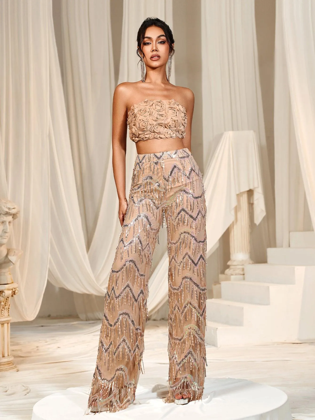Illuminate your evening with our two-piece set, a captivating ensemble that's sure to turn heads. The strapless crop top is adorned with an array of intricate rosettes, giving a three-dimensional floral effect that exudes sophistication. Below, the high-waisted pants dazzle with sequins and beading in undulating patterns, reminiscent of vintage Art Deco glamor. The fringe detail at the hem adds playful movement, making this outfit perfect for dance-filled nights, elegant receptions, or any event where making a glamorous statement is on the agenda.
