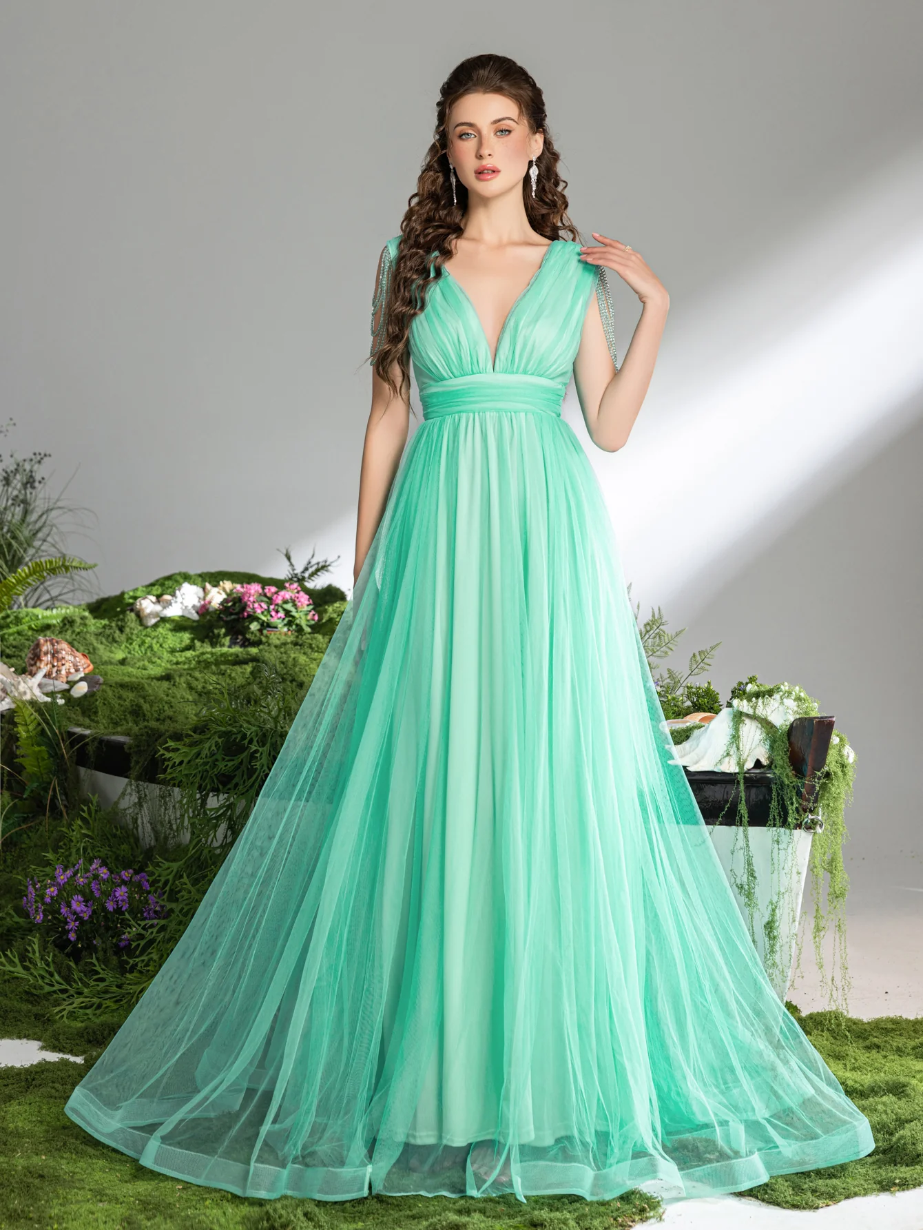 Grace every occasion with our Ethereal Tulle A-Line Gown. A vision of classic elegance, this gown boasts a plunging V-neckline complemented by a gracefully cinched waist and a full, flowing skirt that cascades to the ground in soft folds. Delicate shoulder beading adds a touch of sophistication, while the tailored bodice transitions seamlessly into a voluminous skirt, creating a universally flattering silhouette. Crafted for versatility, this dress is perfect for bridesmaids, proms, and elegant evening affairs, easily adapting to any color to match the theme of your event.