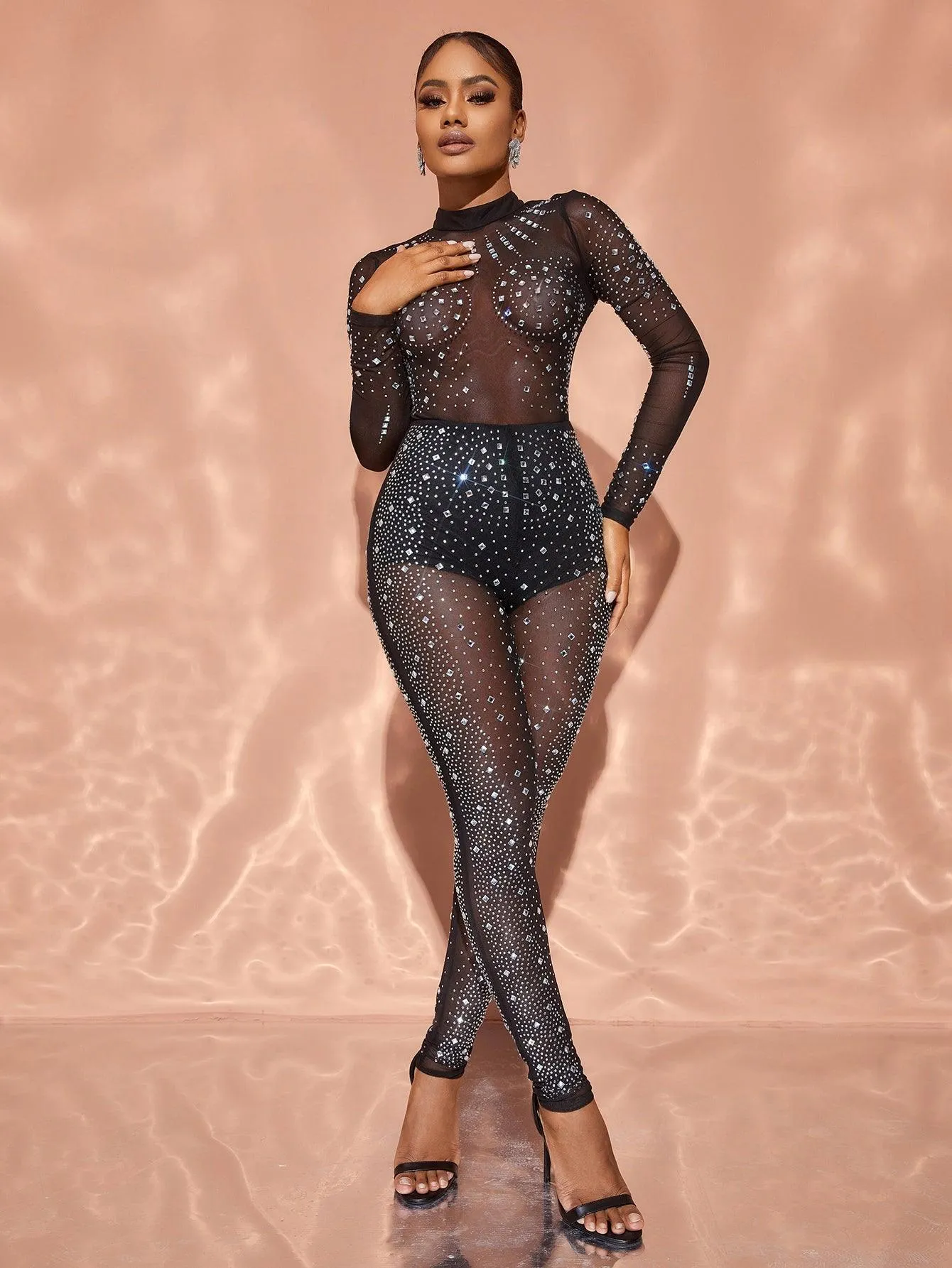 Elevate your night-out wardrobe with this mesmerizing sheer mesh rhinestone bodysuit. Designed to hug your curves and highlight your figure, this bodysuit features intricate rhinestone detailing that sparkles with every move. The sheer fabric provides a tantalizing glimpse of skin, creating a bold and seductive look. The bodysuit includes long sleeves and a high neckline for a balanced blend of allure and sophistication. Perfect for clubbing, parties, or any event where you want to make a dramatic entrance, this bodysuit is a statement piece that exudes confidence and glamour.