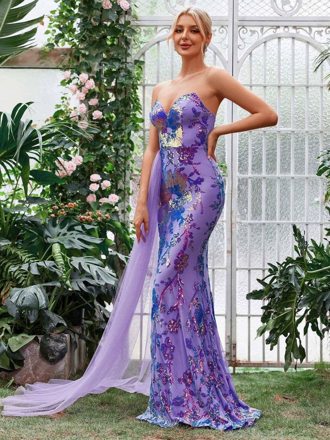 Step into a world of fantasy and allure with this enchanting gown, a masterpiece of vibrant colors and sparkling embellishments. The strapless sweetheart bodice is a canvas for the intricate array of sequined floral patterns that bloom in rich hues of violet and magenta. The slim-fitting silhouette gracefully outlines your curves, flowing down to a flared hem that whispers of mermaid tales and mystical depths. A daring thigh-high slit adds a touch of sensuality to the elegance, balanced by a flowing sheer tulle panel that creates a soft train behind you. With every turn, this gown is a living work of art, perfect for making a bold statement at prom, pageants, or any evening gala where enchantment is the dress code.