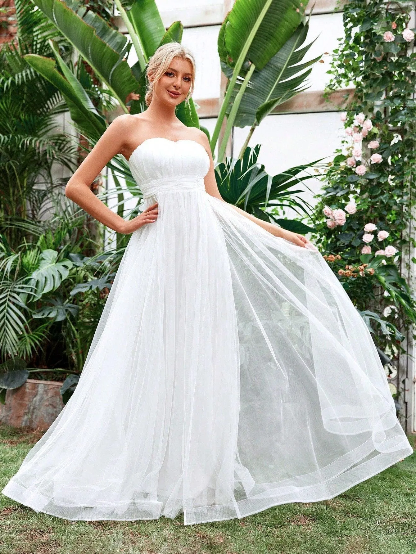 Imbued with the essence of a garden romance, this bridal gown is a hymn to timeless beauty. Its strapless sweetheart neckline is a testament to classic femininity, while the gathered bodice adds texture and depth. The soft flow of tulle falls gently to the ground, creating a full, airy skirt that breathes life with every step. This dress is the perfect choice for a bride who seeks the simple elegance of nature as the backdrop for her vows, with a design that is both effortlessly graceful and endearingly romantic.