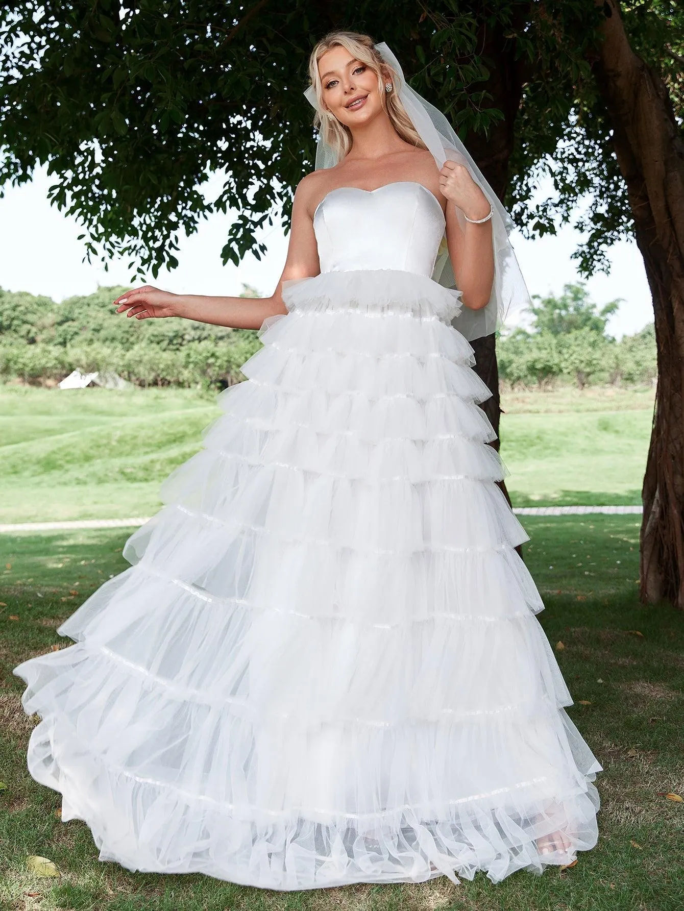 Step into a world of classic romance with our tiered dream bridal gown. This timeless piece flaunts a strapless, sweetheart neckline that transitions into a structured bodice, exuding an air of sophisticated charm. As your gaze drifts downwards, the gown unfolds into a cascade of tiered tulle layers, each tier dancing with a whisper of translucence, creating an enchanting waterfall effect that gracefully pools at the feet. The pristine white palette echoes the purity of love's promise, making this gown a quintessential selection for the bride seeking both tradition and elegance on her journey down the aisle.