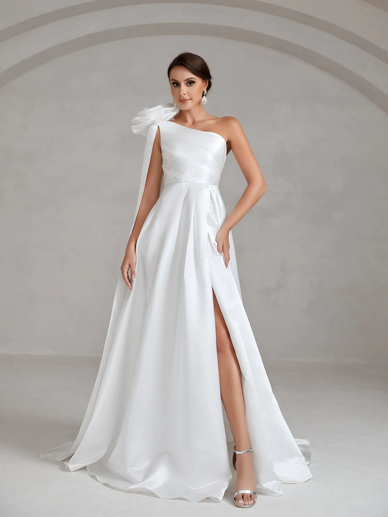Embrace the epitome of bridal grace with this one-shoulder satin bridal gown, adorned with a striking floral embellishment that captures the essence of refined elegance. The gown's smooth satin fabric exudes a soft sheen, enhancing the silhouette as it cascades down to the floor. The eye-catching flower detail adds an enchanting focal point, bringing a delicate, organic touch to the sophisticated design. With a gentle side slit offering a tasteful hint of allure and a sweeping train to leave a lasting impression, this dress is crafted for the bride who cherishes romantic beauty with a dash of distinctive charm.